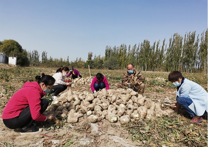 10月14日,结亲干部们来到结对亲戚艾木都拉家,帮忙挖甜菜,大伙主动干,短短几个小时就挖了很多甜菜,看到一个个“胜利果实”,大家露出幸福的笑容。