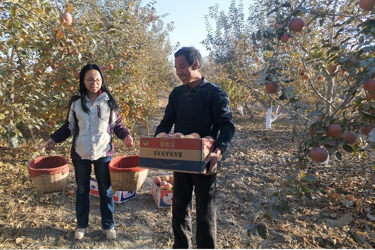 11月4日,赛克孜奥塔克村驻村工作队员们来到了果农刘尧安的苹果园里,来帮助他采摘苹果,他家的苹果被一位内地老板收购了,明天就来装货了,听说他家人手不够,第一书记武永娟听说后,就带着工作队员来帮忙了。