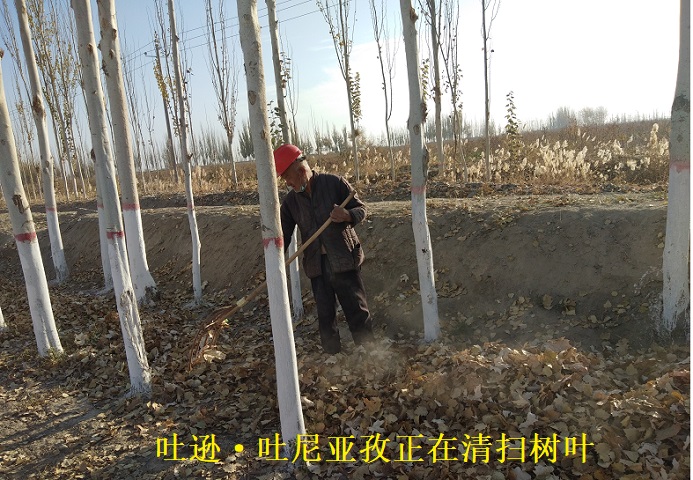 托万克巴格托格拉克村村民吐逊·吐尼亚孜一边扫着落叶,一边说,他家养了20来只羊,为了保护身边绿化美化环境,圈在小院里的羊仅靠秸秆饲料等喂养,一天需要二三十公斤料。今年玉米地收回的青贮饲料还不够喂羊的,而且单一的食物也不利于羊的营养和健康。“我们家门口的这条林带绿化得特别好,栽种的是高大的杨树树木。一到冬季,大量树叶飘落,给防火带来了很大隐患。”吐逊·吐尼亚孜说,这么多树叶埋了怪可惜,于是他们工作队、村“两委”商量,由居民把自家家门口的落叶清扫运回喂羊。每隔一两天,村里的居民就会清扫一遍门前的“责任区”,这些落叶搭配着玉米秸秆和饲料,能让羊吃到来年五月份。
