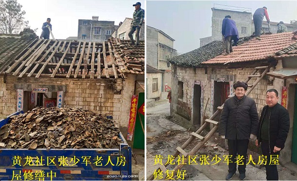 清风网讯(黄龙人民政府:杨 涛)11月29日下午,家住革命苏区襄阳黄龙镇黄龙社区的老人张少军看着房顶被整修一新,心里乐开花,逢人就说:“这下房屋不得漏雨了,感谢社区李书记操心呀。”