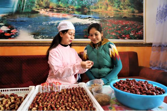 12月22日,新疆库车市哈尼喀塔木乡的妇女在核桃合作社内生产枣夹核桃。近年来,该乡通过“党支部+合作社+农户”的模式,延长核桃产业链,生产的枣夹核桃特色产品通过电商平台,销往乌鲁木齐、上海、哈尔滨、河北等疆内外市场,实现农民增收致富。