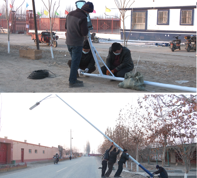 施工队队员亚森·依布拉依木说:“来到古再勒博斯坦村装路灯,虽然天气很冷,但是能为村民出行提供方便,我真的很高兴。”