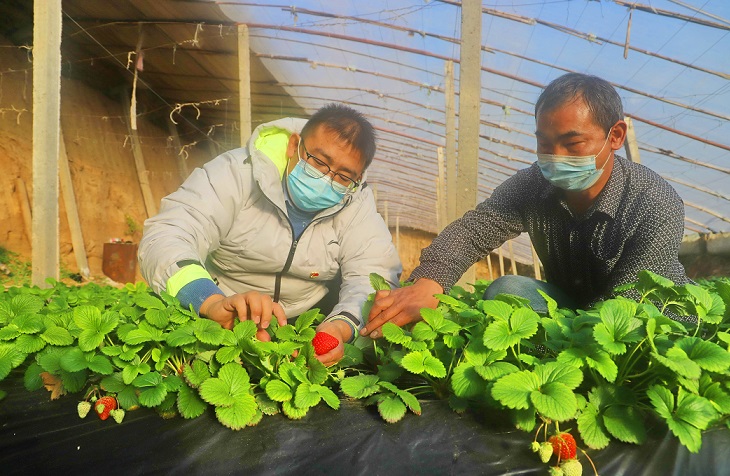 1月15日,库车市住房和城乡建设局驻乌恰镇乌恰三村“访惠聚”第一书记张琦(左一)在温室大棚内和农户查看即将成熟的草莓。近年来,该市坚持党建引领,加快推进农业产业化转型升级,发展有机果蔬种植,同时利用网络推广和直播带货,拓展销售渠道,带动村民致富。
