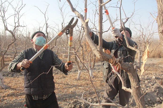 1月16日,阿瓦提县塔木托格拉克镇林果业专业合作社技术人员在诺其宋村修剪枣树。该镇采取“合作社+农户”种植模式发展林果业,帮助果农增收。