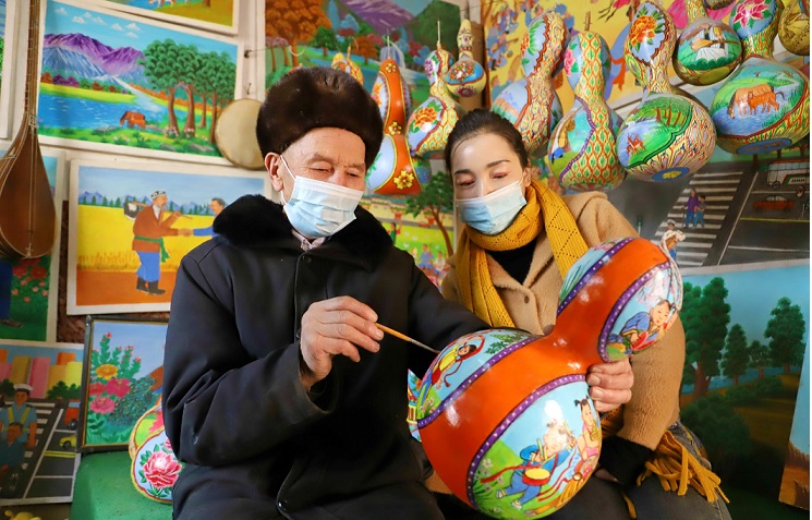 1月22日,新疆库车市乌恰镇民间艺人为学徒讲解葫芦画创作技法。近年来,库车市大力弘扬“民间工匠”精神,深入开展“师带徒”活动,通过以老带新,教学相长,不断提高技能水平。