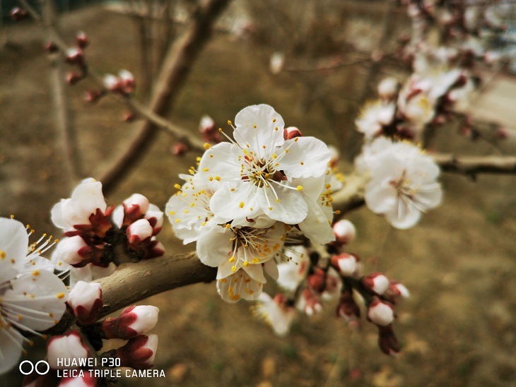 看到杏花开放,我心情大好,杏花虽然没有"美人把梅嗅”的风姿,却清淡雅致,不与百花争艳,很早的就把她的清秀展示给我们。一朵朵小巧玲珑的杏花或三三两两,或一簇簇缀满枝头,从枝桠间层层透过,勤劳的小蜜蜂也开始了忙碌的一天,哼着小曲儿一会儿向东,一会儿向西,一头扎向一个花朵去采粉。
