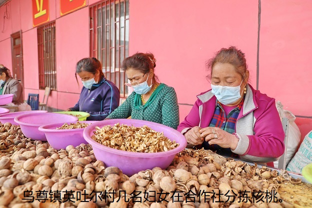 3月29日,新疆库车市乌尊镇英吐尔村几名妇女在合作社分拣核桃。今年以来,该镇党委按照党支部领办合作社、合作社发展产业、产业联结农户的思路,采取独立自主经营模式,深化核桃产业链,做好做优经营实体,主动联系邻近村抱团发展,推动党支部领办村集体合作社提质增效。