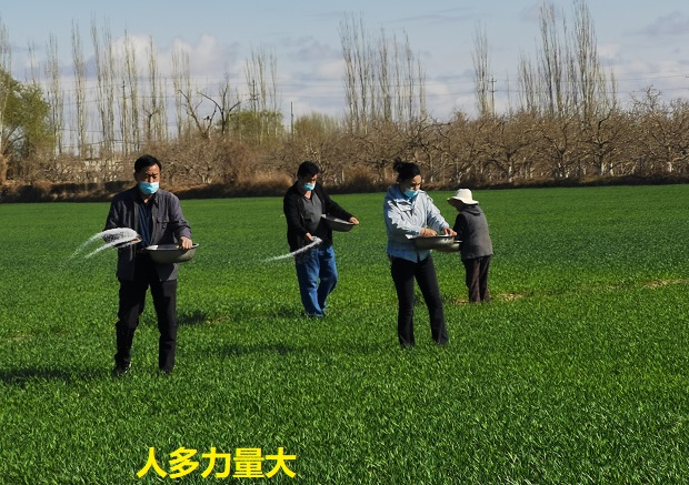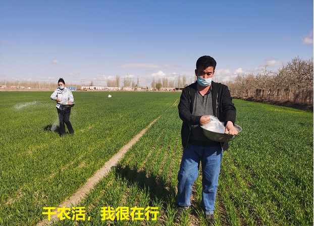 “李磊,人勤地不懒,好好干,化肥撒完、水浇完后,其他麦田管理工作也要跟上,有啥需要解决的困难随时打电话。近期地温回升快,可千万不能耽误麦子生长旺盛期的农时”正在现场撒化肥的“访惠聚”工作队员买合木提·平山说。