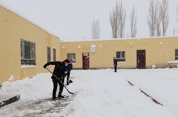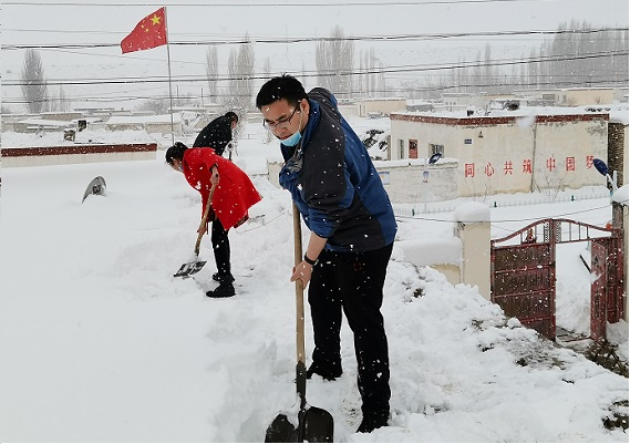 一夜间,雪花飘然,银装素裹。这天于晨,地区工信局驻拜城县黑英山乡米斯布拉克村“访惠聚”工作队副队长冯波,像往常一样,起床第一件事,打开门窗通风,奈何门窗推拉不动,只见窗外,洁白一片。经观察昨日一场大雪将门窗堵塞,预计降雪量达35㎝。于是他立即向第一书记申华(地区工信局油区服务协调中心综合科科长)汇报雪情,并叫醒村党支部书记吐尔逊·肉孜,通知所有在村力量组织群众立即清理积雪。同时,把本村雪情向乡党委领导汇报、请求指示。