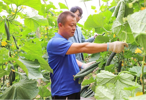 4月26日,新疆库车市乌恰镇乌恰三村农户正在采摘黄瓜。今年以来,该镇党委坚持党建引领,把设施农业作为乡村振兴的重要抓手,因地制宜大力发展大棚蔬菜、草莓、果树种植等,并利用电商平台线上线下并驾销售,助力农民增收致富。