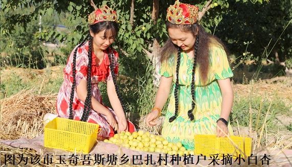 近年来,新疆库车市在农业结构调整中采用“党支部+合作社+基地+农户”的方式,引导农民发展小白杏种植,把荒地变果园,促进农民增收,助力乡村振兴。图为该市玉奇吾斯塘乡巴扎村种植户采摘小白杏。