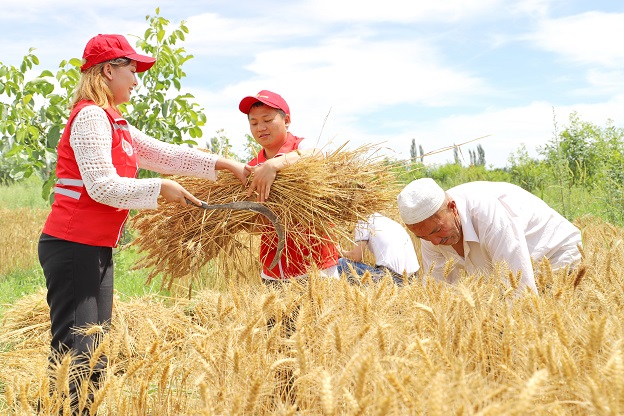 6月20日,库车市乌恰镇党员干部帮助农户收割小麦。眼下,正值夏粮收获期,该市组织各级党员干部深入田间地头,助力缺劳农户开展农耕生产,推动“我为群众办实事”实践活动走深走实。吴乐摄