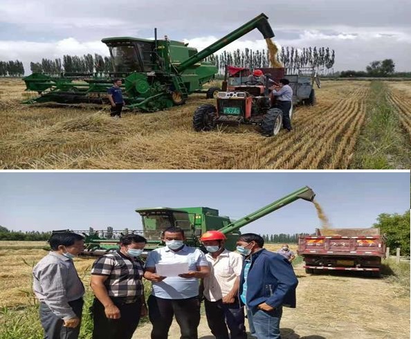 一片片金色的麦子向人们宣告丰收的到来,一台台联合收割机轰隆隆来回穿梭在田野间,一片片麦子都喂进了收割机的肚子,吐出了金灿灿的麦子。阿瓦提县今年种植了29.5万亩小麦,农业农村局已经将290台联合收割机检修调试完毕,已经从北疆引入35台联合收割机,现我县联合收割机完全满足小麦收割的任务,保证按时保质保量完成收割任务,不耽误农时。为了顺利完成夏收工作,农业农村局农机技术人员深入田间地头进行农机技术指导和安全生产监督检查,宣传村民、农机手做好防火、安全生产的措施。截止目前,我县已经完成小麦收割面积12.65万亩。(阿瓦提县农业农村局: 何重清)