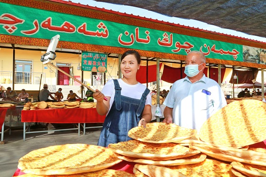7月26日,新疆库车市乡土人才正在通过手机直播帮助村民推销特产馕饼。近年来,该市充分发挥乡土人才的示范带动作用,采取“线上”乡土人才直播带货和“线下”发展订单农业相结合发展模式,实现群众增收致富,助力乡村振兴。