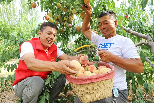 8月16日,新疆库车市审计局驻比西巴格乡其乃巴格村工作队队员帮助村民采摘水蜜桃。党史学习教育开展以来,该工作队积极开展“我为群众办实事”活动,组织党员干部深入田间地头、农家小院,为群众送政策、送技术、送服务,切实解决基层的困难事、群众的烦心事。
