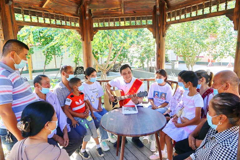 9月9日,新疆库车市机关干部通过弹唱的方式给居民宣传党的好政策。近年来,该市积极发挥基层党组织战斗堡垒作用,以“双报到、双报告、双服务”为抓手,推动党员干部下到社区开展集中走访、察民情、访民意、排隐患、解民忧,架起干群“连心桥”。