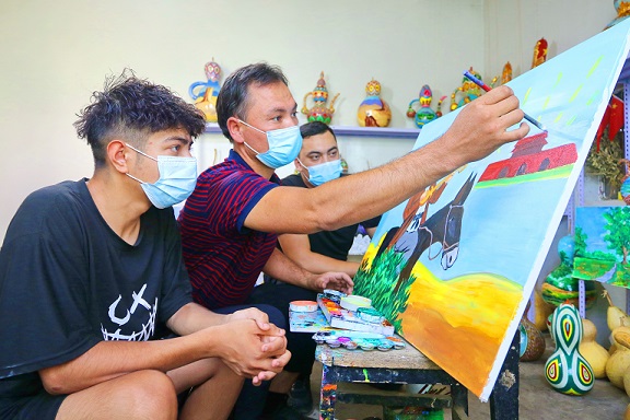 月9日,新疆库车市乌恰镇乡土人才艾则孜·木沙(中)指导学徒掌握农民画绘画技巧。近年来,该市大力实施农村人才工作室“导师带徒”制度,通过带徒传技、技能攻关、技艺传承、技术推广等方式,帮带培养农村实用人才。