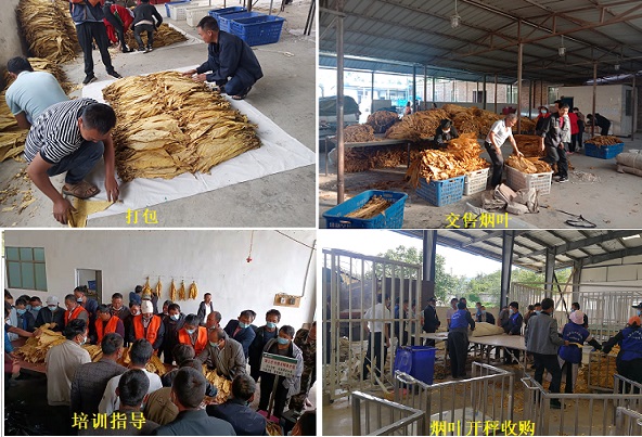 清晨,新华烟站热闹非凡,一辆辆满载金黄色烟叶的车辆开进收购站,整齐地排队卸货。金黄的烟叶堆积如山,站点工作人员紧张有序忙碌着,上台、定级、装框、上秤、入库、堆码,打包,秩序井然。