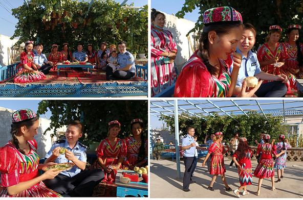 “盛世欢歌颂党恩,同心共祝新时代”。阿依古丽的院子里瓜果飘香、团结情深,处处洋溢着浓浓的节日气氛。葡萄架下传来一阵阵欢声笑语,原来是民警和亲戚们在开心畅谈,增进友谊,促进感情。