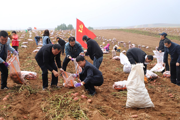 活动现场,全体党员干部和来自首府附二中的学生及家长们严格按照土豆分拣要求,团结协作、互帮互助、划片包干,大家拎着袋子、蹲下身子、撸起袖子,捡的捡、装的装、扎口的扎口,穿梭在田间地头,一派热火朝天的繁忙景象。大家用实际行动抢抓农时助力秋收,为农户实现巩固拓展脱贫攻坚成果同乡村振兴有效衔接贡献自己的力量。