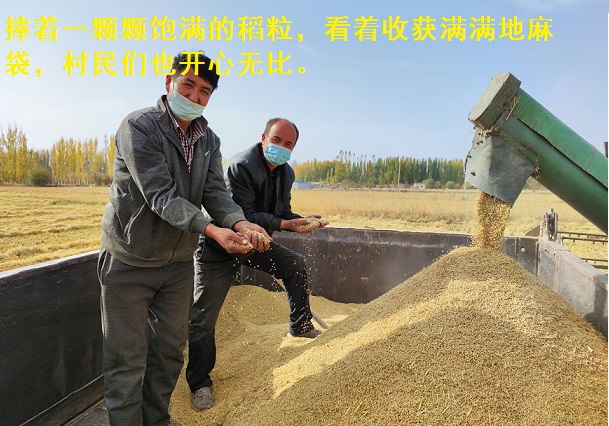 稻田中谷穗金黄低垂,颗粒饱满充盈,在秋日中散发着硕果的光芒,等待着农民的丰收。水稻是吐木秀克村的主要农作物,今年,吐木秀克村采用优质水稻种子,加上科学的田间管理,水稻喜获丰收。“我家种了20亩水稻,工作队、‘村两委’还邀请技术人员经常来给我指导,水稻产量很高,每亩地可以收入1500-1800元,相比去年实现了增收,我非常开心。”毛尼亚孜·吐尔地说。