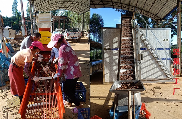 平村乡不仅是蔗糖原料种植之地,也是万亩坚果之乡。2021年,全乡坚果总面积达3.8万亩,现已初步挂果4320亩,总产量460吨。为进一步带动坚果产业稳步发展,该乡于今年9月新建首个坚果加工厂,并与云澳达坚果开发有限公司和众誉坚果加工公司达成合作协议,以“公司+合作社+农户”的运营模式解决了坚果种植户销路难的问题,同时也为部分贫困户提供了就业平台。据了解,该加工厂投产运营后,三天可完成坚果初加工10吨,每吨产值38000元,与直接销售青皮果相比,每吨可以实现增收5200元左右。随着3.8万亩坚果陆续挂果,该乡将积极争取项目,逐步扩大坚果初加工厂规模,加快培育以澳洲坚果产业为主体的支柱产业,延伸产业链,不断推动坚果产业从一产向二产的转变。