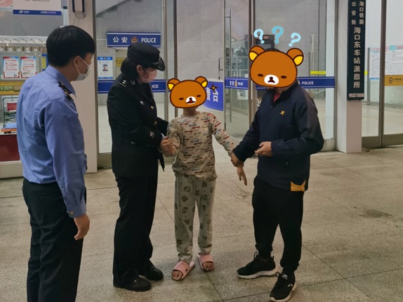 据介绍,11月28日20时许,海口东车站派出所执勤民警在广场开展巡逻时,发现一名10岁左右的男孩在海口东站B出站口处徘徊,旁边没有家长陪同,疑似与家人走失,便将其带至接警室询问情况,在试图交谈中,民警发现该男孩答非所问,不能正常沟通交流,且随身未携带任何物品,无法获得有效信息。初步判定该男孩系走失人员,值班所领导立即多方联系查找,并通过微信发布该男孩的照片、走失地点等信息,以此扩散寻找,终于在21时20分联系到男孩父亲周先生(44岁,贵州省务川县人)。