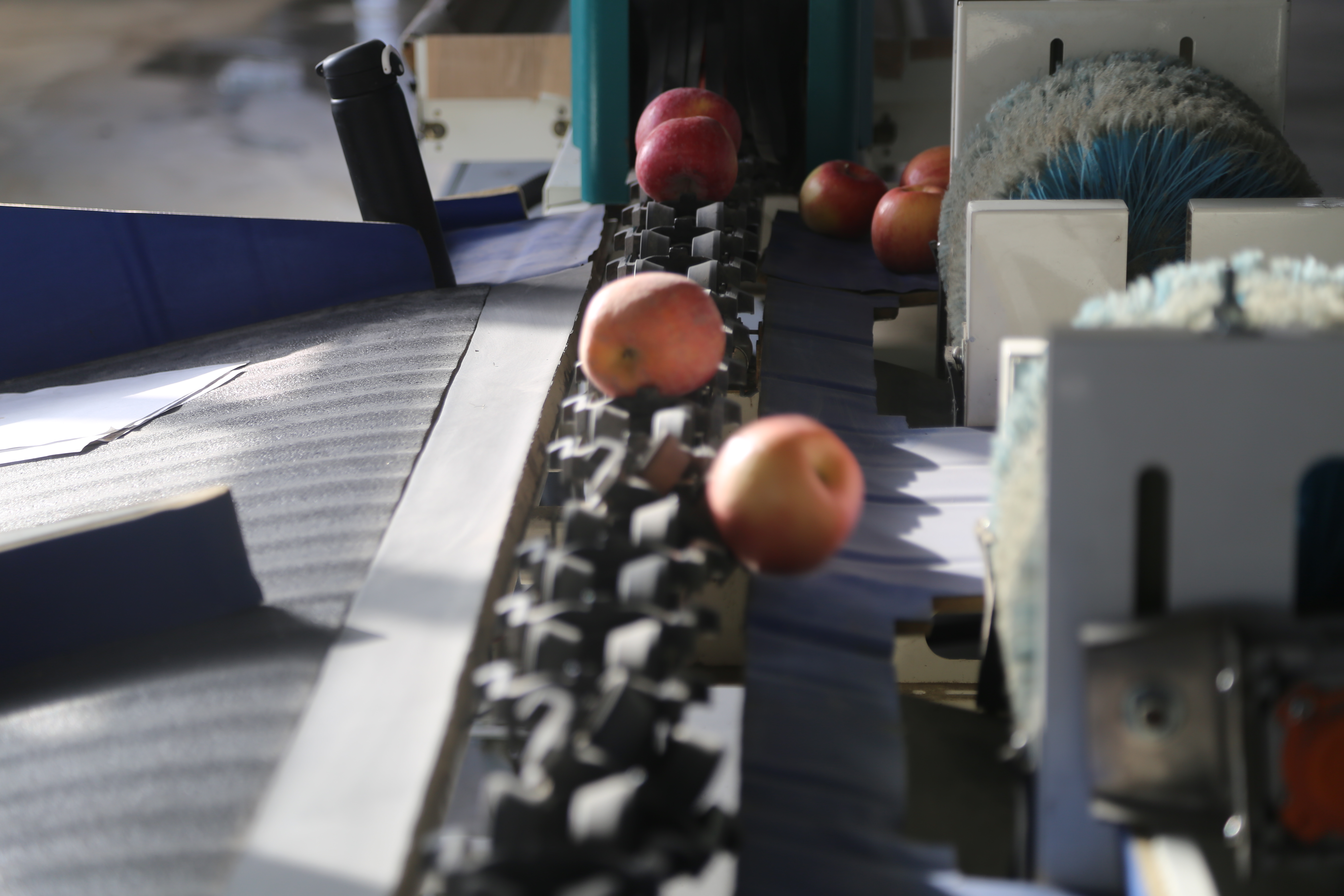 “我们这个车间集清洗、保鲜、烘干、分拣等一体化、智能化作业,苹果通过预先编程好称重区后,在链条运输过程中,链条通过倾斜,自动将苹果分到各个区间,不仅如此,我们这个机器还有识别颜色、直径、瑕疵等功能,这条分拣线一分钟可以分拣400左右的苹果,一天下来可以分拣20-30吨之间,完全可以吃得下六团果园生产期的果子。”果品精选厂房主要负责人刘志远说。