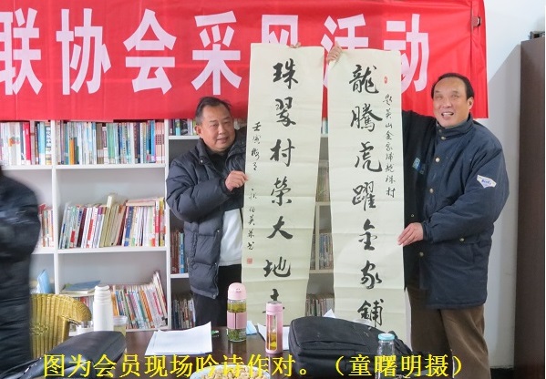 采风活动中,参加会员通过听取龙珠村介绍历史文化、风景名胜、农村党员分类管理的典型经验等,创作一批风土、人文、历史、文化、风景的诗词楹联作品,现场挥毫吟诗作对。赵立平现场《题龙珠村》:“龙珠抱玉土门潭,放马西河最壮观。胜地腾蛟还起凤,灵山舞鹤又飞鸾。难忘竹筏浮云浪,最忆沙鸥戏雪滩。六口塘前水中月,蟾光照影送波澜”。曾经被中央电视台报道过的老会员王德生《赞英山龙珠村(新韵)》:“西河百里位中间,南北迎宾展笑颜。鼎姓依龙珠傍玉,芳名联袂土门坛。楼衢携手三千树,亭榭扬光十八湾。紧绕村容兴建设,如诗如画树标竿。”