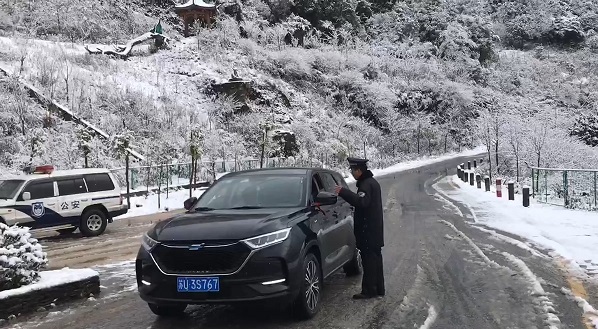 而在景区外,鲁史派出所的民警不惧寒冷、不怕辛苦,他们将道路上的雨雪进行清理并温情提示往来行人游客小心驾驶、安全出行,为行人游客保驾护航。