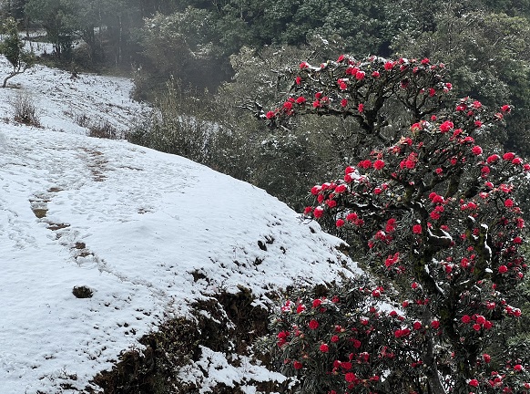 五道河漫漫林海在迎来春雪后,山间的茶树等各类林木银装素裹,呈现出和谐宁静的景致,迎风绽放摇曳的山茶花,此刻平添一番别样韵味。