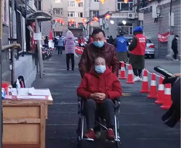 2月26日清晨,一位值守在人民路街道丽景小区疫情防控点上的纪检监察干部,拿着手中的相机记录下了令人感动的一幕。画面中,一位坐着轮椅的老人在家人的帮助下早早来到小区核酸检测点位,排队进行核检后,家人推着老人回家。