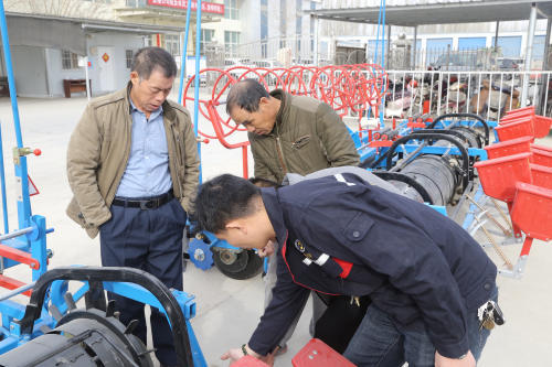 农业生产全程机械化是实现农业现代化的必由之路。在新疆阿拉尔金准机械制造有限公司生产基地,公司销售经理雷明带领着购买农机的职工们参观,详细介绍了新型“干播湿出”播种机的优点及售后服务。雷明告诉大家:“我们新型播种机主要优势在于安装完后,基本不需要调试,铺膜播种后,两膜交接行之间不拥土,膜面更完整平整。刚过完年我们公司就开始大热卖了,目前为止已经接到南疆订单300余台,其中光七团就有27台。客户使用播种机之前,公司还会派专业技术人员进行上门指导,精心做好售后服务,为推广‘干播湿出’技术提供强力支撑。”