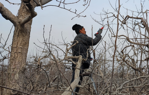 梨园里,果农们或是踩树枝、或是趴梯子,用电剪刀或钢锯井然有序修剪掉梨树地弱枝、病枝、过密枝,为果树养分地有效输送,果品地高质高产做进一步精细地管理工作。