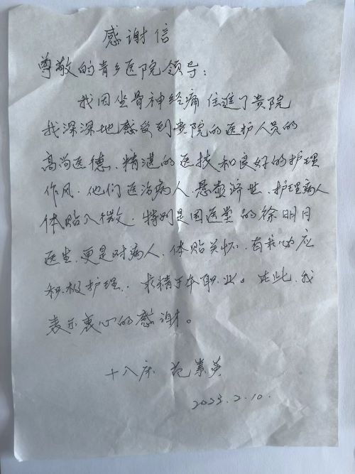 近日,山东省昌邑市青乡社区卫生服务中心收到一份特殊的礼物——曾在青乡社区住院治疗的范女士亲笔书写的表扬信一封。信中范女士情真意切地记述了她在青乡社区住院治疗期间的切身感受,对青乡社区医务人员的高尚医德、敬业精神和精湛医术表示高度赞扬,感激之情更是跃然纸上。尤其是对国医堂徐明月大夫的服务更是给予充分肯定。
