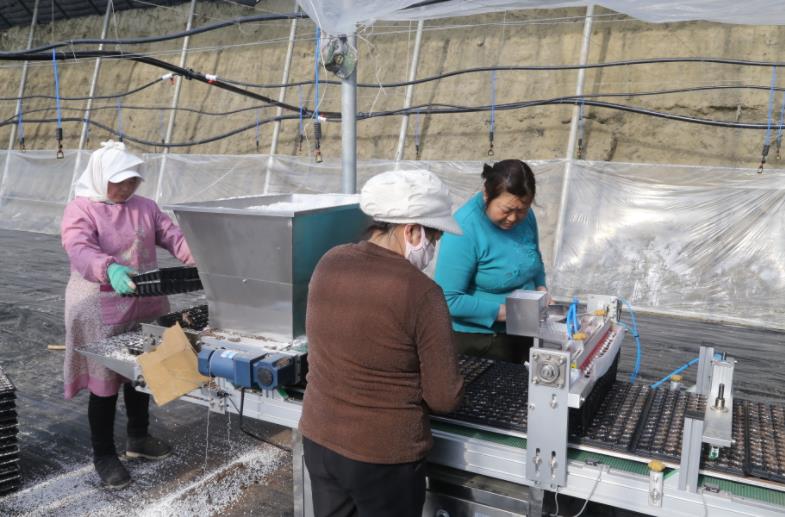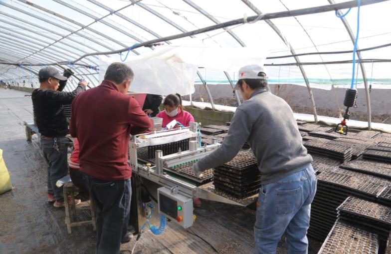 走进七团六连育苗基地内,机器声嗡嗡作响,10余名工人正在进行辣椒育苗,自动化育苗播种机高效运作,工人们只需按序将穴盘放上传送带,把辣椒种子倒入点种处,其余添土、点种、铺盘、压穴、刮平等系列播种工作将由播种机的自动流水线完成,机械化育苗播种速度快,效率是人工育苗播种的10倍左右,每小时可育苗600到700盘,容器盘里主要培育辣椒苗,预计在3月初陆续出售。