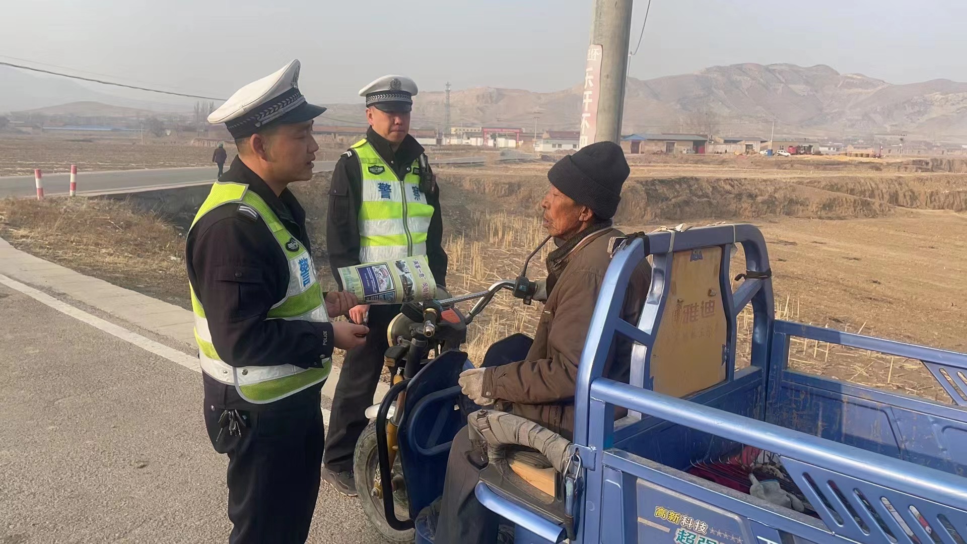 天气回暖,农村备战春耕也陆续展开,各种农用车辆出动频繁,交通安全风险明显增多。为进一步提升广大农村群众交通安全意识和风险防范意识,有效减少农村道路交通事故发生,确保备耕时节农村交通形势平稳。连日来,山西省大同市浑源县公安局交通管理大队组织警力深入农村有针对性地开展农村道路交通安全宣传教育活动,全面护航辖区道路交通安全。