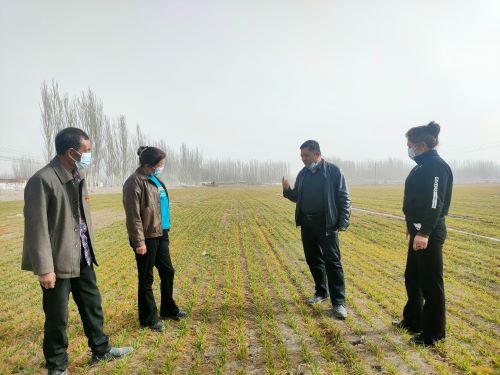 近日,在大桥乡奥吾其格村冬小麦地里,县农业农村局驻大桥乡奥吾其格村“访惠聚”工作队队员深入田间查看小麦苗情、墒情,与种植户沟通滴水事宜。
