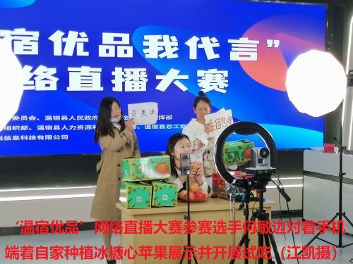 “直播间的宝宝们,你们好!新疆阿克苏冰糖心苹果水分足、糖分高,好吃看得见,买到就是赚到!我们送出的福利,是在别的直播间没有的独一无二的优质货。关注主播不迷路,主播带你上高速。”‘温宿优品’网络直播大赛参赛选手何敏边对着手机端着自家种植的冰糖心苹果展示,边激情直播。