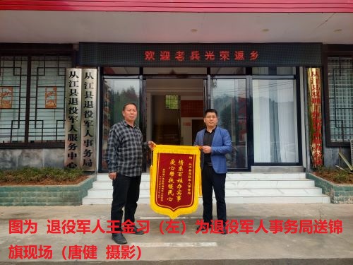 “感谢党和政府,感谢‘娘家’为我排忧解难和关爱帮助……”。3月27日,从江县籍退役军人王金习将一面绣有“情系百姓办实事·爱心帮扶暖民心”的锦旗送到县退役军人事务局,表达对从江县退役军人事务局心系退役老兵和及时关爱帮扶退役军人的感谢。
