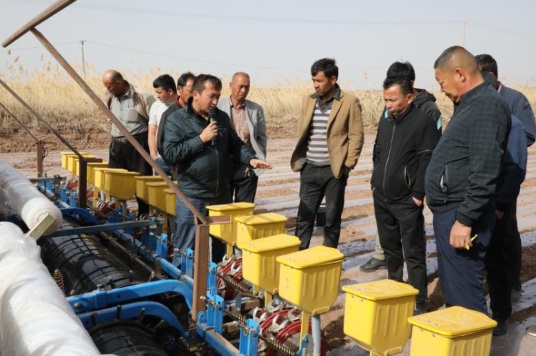 3月30日,新疆阿克苏地区柯坪县启浪乡村民在学习棉花“干播湿出”播种技术。
