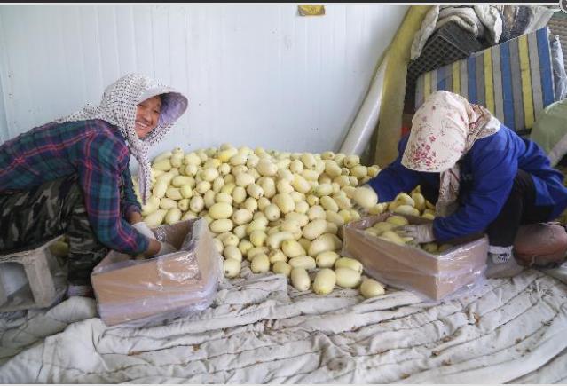 在七团六连蔬菜种植基地内,一个个手臂粗的羊角蜜挂满枝头,长势喜人,来往的职工们正忙着采摘装筐,现场呈现一派繁忙的作业景象和丰收的喜悦。