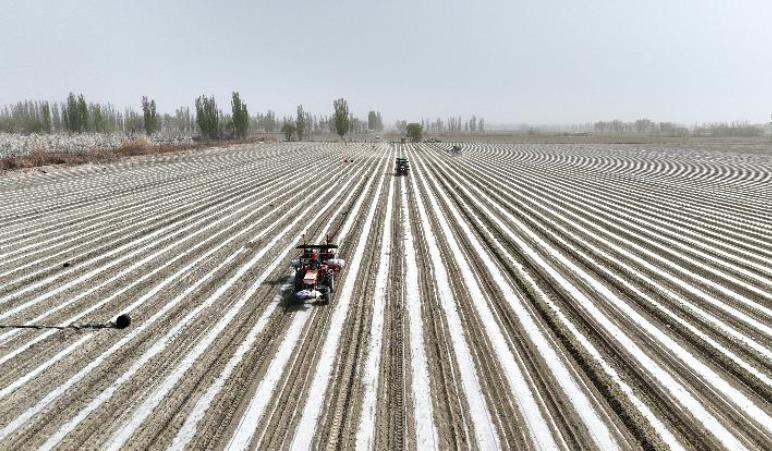 4月10日,走进新疆兵团一师七团十一连四号150亩辣椒地,9台新式自动辣椒播种机正在进行辣椒移栽作业,打孔、栽植、封孔、培土一系列步骤有条不紊地进行。机械化辣椒移栽的过程大大提升了移栽效率,农机成为了辣椒地的“主角”。
