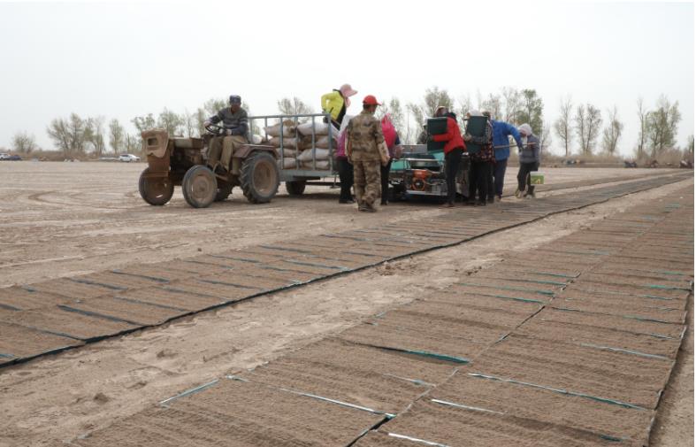 4月12日,新疆生产建设兵团第一师二团职工在利用拖拉机进行水稻旱地托盘育秧作业。