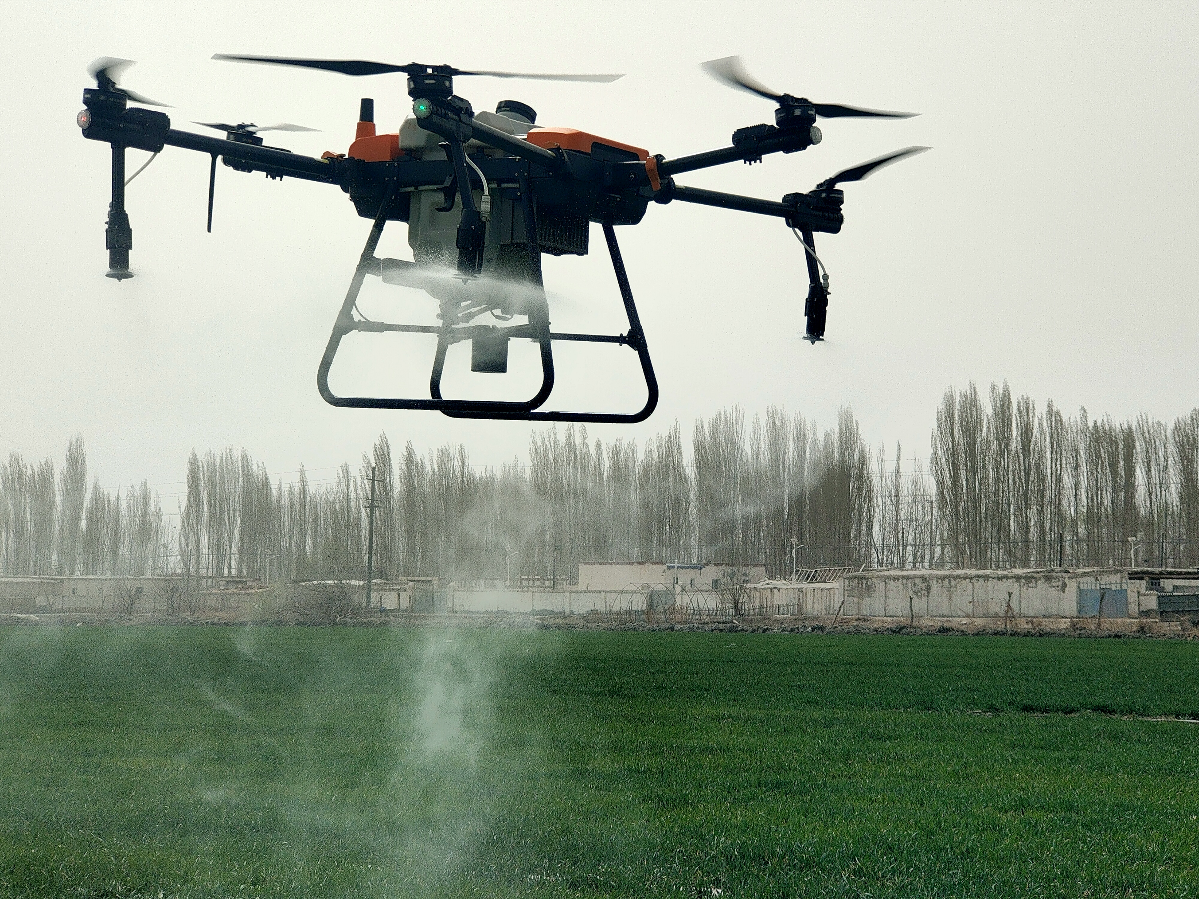 眼下正值冬小麦春季管理的关键时节。近日,在大桥乡阿克塔木村的麦田里能看到,一架架农用植保无人机在技术人员的操作下,在麦田上空来回穿梭,在距离麦田数米的空中喷洒农药,270余亩小麦田不到2个小时时间就完成了农药喷洒工作。
