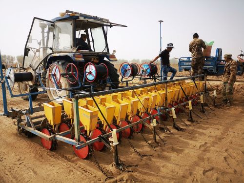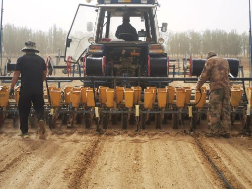 在九团十九连2斗10号、1斗11号田地里,脸上沾满沙尘的职工田国见等几人正在逆风提着重重的农具艰难跟机前行旱直播水稻种子。时而滴管带脱落,时而机械卡阻,间接拖慢了播种进度,使得他们不敢耽搁每一分钟,连午饭都随便扒拉两口。