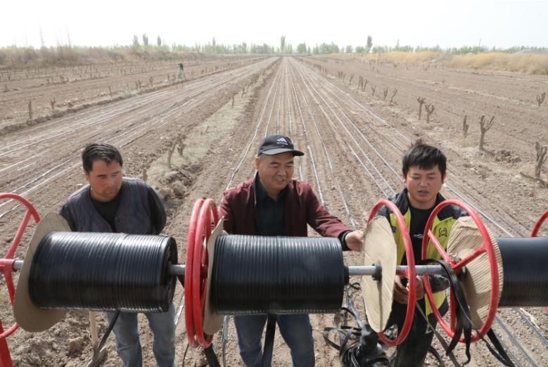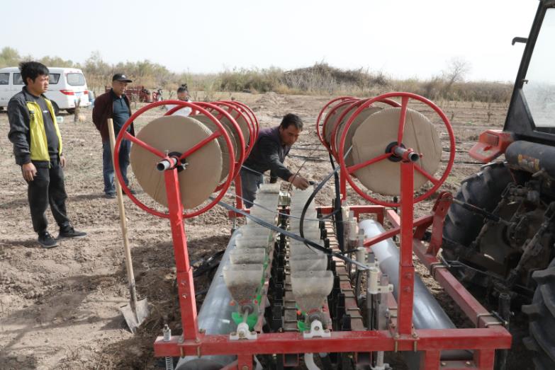 4月25日,在新疆生产建设兵团第一师二团十连职工许圣友枣园地里,一台拖拉机来回穿梭,有序进行铺设滴灌带、播种板蓝根作业。