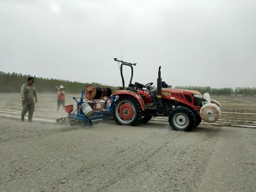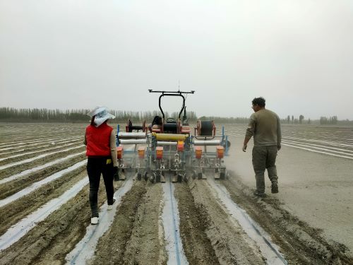大桥乡党委副书记、乡长艾山江·吐尼亚孜介绍说:“今年种植户采用‘北斗导航+干播湿出’节水播种新技术,大桥乡选派技术人员详细地向农民讲解“干播湿出”的技术要点。通过这种播种新技术,土壤不需要进行春灌,可节省大量水资源同时,还可以避免遇雨后板结,有效提高农作物出苗率”。