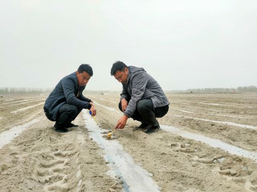 新疆天玉种业有限责任公司技术员吐尔地·艾合买提:“我身后是500余亩制种玉米大田,全部采用干播湿出技术,这两天在进行管道布置、数据采集和数据监测,准备今天灌出苗水,经过测算和实验,干播湿出技术效果明显,目前一些种植户和合作社都已经采用我们这项技术,从反馈的情况来看,效果比较好。”