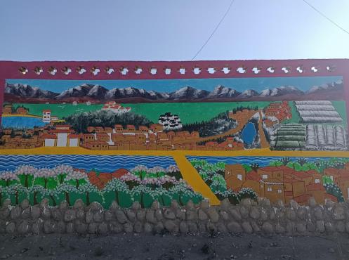 走进温宿县吐木秀克镇托万斯日木村白玉兰居民点,农家小院外墙上各色各样的彩色墙绘格外引人注目,与“小长城”景观带和民族团结文化长廊交相呼应,在远处天山托木尔峰的映衬下仿若仙境一般。来自新疆理工学院的廖进粮、王翊、李小玺三位老师手拿绘画工具、自制颜料桶,定位、勾线、调色、上色,在他们繁忙而有序的勾勒下,一幅幅精致的绘画与墙体巧妙融合,昔日单调光秃的墙面瞬间有了生命、灵动起来。
